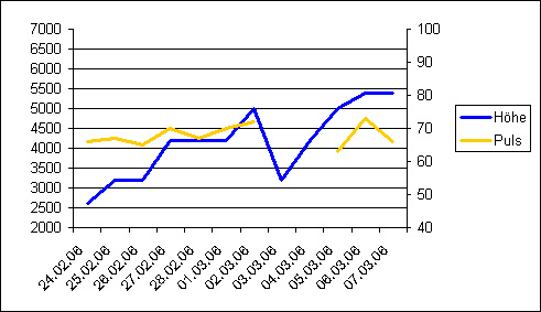 Akklimatisation Jeder Mensch akklimatisiert unterschiedlich gut und unterschiedlich schnell. Dabei spielen Kondition, Geschlecht und Alter keine Rolle. Oder anders gesagt: man muss nur schnell genug aufsteigen um höhenkrank zu werden. Würde uns ein Hubschrauber aus dem Tal bis auf den Gipfel des Aconcaguas bringen und dort absetzen, so würden wir innerhalb weniger Minuten sterben. Deshalb müssen wir dem Körper Zeit geben sich an die Höhe zu gewöhnen. Den Fortschritt der Akklimatisation kann man einfach kontrollieren indem man jeden Morgen vor dem Aufstehen den Ruhepuls kontrolliert und aufschreibt. Steigt man in höhere Lagen auf und schläft dort, so wird der Ruhepuls am nächsten Morgen etwas erhöht sein. Während man auf dieser neuen Höhe bleibt sollte der Ruhepuls in den nächsten Tagen wieder absinken. Erst dann kann man weiter aufsteigen und der Akklimatisationsprozess beginnt von neuem. Besonders effektiv ist es höher aufzusteigen als man schläft (climb high - sleep low). Ebenfalls begünstigend wirkt sich langsames Aufsteigen auf die Akklimatisation aus (wer schneller geht als ein Esel ist ein Esel). Man könnte meinen dass Kondition also keine Rolle spielt, doch dem ist nicht so. Eine gute Kondition stellt eine Sicherheitsreserve dar und am Gipfeltag kann sie über Erfolg und Misserfolg entscheiden.