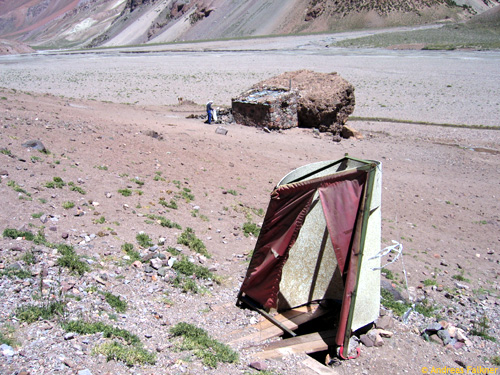 Bücher  Was sonst noch interessant ist Permit: Das Permit ist nur in Mendoza im "Subsecretaria de Turismo" (San Martín 1143) erhältlich und muss persönlich abgeholt werden. Die Öffnungszeiten sind Mo - Fr 8:00 - 18:00 und Sa/So 9:00 - 13:00. Es ist 20 Tage ab Ausstellung gültig. Die Bezahlung erfolgt nach Ausfüllen des Formulars einen Häuserblock weiter in einer Art Bank (in argentinischen Pesos auch wenn die Permitpreise meist in US$ angegeben sind). Gaskartuschen: Da man Gaskartuschen ja nicht mehr im Flugzeug mitnehmen darf, ist man darauf angewiesen diese vor Ort zu kaufen. Alle Typen sind z.b. im Bergsportgeschäft "Casa Orviz" erhältlich. Selbst die Schraubkartuschen für PRIMUS- oder Colemankocher bekommt man da. Außerdem kann man auch Ausrüstungsgegenstände kaufen oder leihen. Muliservice: Wer sein Gepäck mit dem Muli ins Basislager tragen lassen will, der kann den Muliservice in Mendoza buchen oder aber vor Ort z.b. bei "LOS_PUQUIOS"_(Rudy_Parra) (LOS PUQUIOS ist 1500m vor Puente del Inca aus Rtg. Mendoza kommend [vor dem Bergsteigerfriedhof "Cementerio de los Andinistas"]), was etwas billiger ist. Transport: Nach Mendoza kommt man z.b. mit dem Bus von Santiago de Chile (Fahrzeit ca. 6h). Achtung: keine offenen Lebensmittel, Fleisch, Obst oder Gemüse mit über die Grenze nehmen. Die Busse fahren mehrmals täglich ab dem Terminal de Sur (U-Bahn Station Universidad de Santiago). Wer morgens mit dem Bus von Santiago nach Mendoza fährt, kann man am gleichen Tage noch das Permit in Mendoza besorgen. Von Mendoza bis Punte del Vacas sind es 163km, weitere 12km sind es bis Puente del Incas. Man kann mit dem Taxi fahren oder den Bus nehmen (10:15 und 18:00 ab Busterminal Mendoza, "Expreso Uspallata" von Mendoza nach Las Cuevas hält da, wenn man den Fahrer fragt). Essen: In den Lagern Confluencia, Plaza de Mulas und Plaza Argentina kann man in den Zelten verschiedener Expeditionsveranstalter etwas zu essen oder zu trinken bekommen (z.B. Pizza oder Steak mit Pommes für US$ 15, Bier oder Cola für US$ 5). Wasser: Trinkwasser kann man bis zum Basislager aus den Bächen nehmen, sollte es aber vorher wegen den Maul- oder anderen Säugetieren, die keine Toiletten benutzen, unbedingt desinfizieren (z.b. mit Micropur). Auf Lager 1 hat man nachmittags Schmelzwasser aus den Büsereisfeldern. Manchmal muss man allerdings auch schon auf Lager 1 Schnee oder Eis schmelzen (spätestens in Lager 2). Ärztliche Hilfe: In den Basislagern Plaza de Mulas und Plaza Argentina ist ein Arzt (oder Medizinstudent) vor Ort, an dem "man nicht vorbeikommt". Er checkt Puls, Blutdruck, horcht einen ab und misst die Sauerstoffsättigung des Blutes. Bergsteiger mit Bluthochdruck oder zu geringer Sauerstoffsättigung des Blutes checkt er mehrmals und hindert sie ggf. am weiteren Aufstieg oder lässt sie noch einmal absteigen. Der Arzt hat bestimmte Richtlinien in Bezug auf kritische Parameter nach denen er entscheidet. Außerdem steht eine Hütte für Kranke bereit, die notfalls beheizt werden kann. Sauerstoff aus der Flasche sowie alle gängigen Medikamente für Höhenkranke sind ebenfalls in der Hütte des Arztes. Im Falle von HAPE oder HACE bzw. anderen Notfällen wird man mit dem Helikopter ausgeflogen (sofern das Wetter es erlaubt) und ins nächste Krankenhaus gebracht. Parkranger: In den Basislagern Plaza de Mulas und Plaza Argentina, sowie in Las Lenas stehen Hütten der Parkranger. Sie verfügen über Funkgeräte mit denen sie Kontakt zu anderen Lagern aufnehmen können. Außerdem haben sie stets mehr oder minder brauchbare Informationen über das Wetter in den nächsten 2 Tagen. Die Parkranger checken das Permit jedes einzelnen und geben die Tüten für Müll und Fäkalien aus. Telefon: In den Basislagern Plaza de Mulas und Plaza Argentina haben die verschiedenen Expeditionsveranstalter Satelitentelefone, die man gegen Entgeld benutzen kann (ca. US$ 6/min). Handys funktionieren auf grund der großen Entfernung zum nächsten Sendemast nicht. Tipps zur Ausrüstung Zelt: Das Zelt muss extrem windstabil sein. Auf Heringe kann man verzichten. Statt dessen benutzt man Steine wie Anker, an denen man die Zeltschnüre befestigt. Ab Lager 1 kann man Schnee und Eis rings um das Zelt schichten. Alustangen, die man im Schnee eingräbt und an denen man die Zeltschnüre befestigt können ganz hilfreich sein. Aufpassen muss man beim Aufbauen des Zeltes. Wenn das Zelt kaputt geht, dann meistens beim Aufbau (wenn es mal steht hält es in aller Regel). Tipp: Innenzelt ausbreiten und die Rucksäcke reinlegen, dann wenn der Wind mal etwas nachlässt blitzschnell aufbauen. Extrem gut verankern und verspannen. Schuhe: Bis zu den Basislagern genügen leichte Trekkingschuhe oder auch Turnschuhe. Ab dem Basislager, spätestens aber ab den Hochlagern sind Plastikbergschuhe zwingend erforderlich. Von Lederbergschuhen (z.B. La Sportiva Nepal Top) wird allgemein abgeraten. Jedes Jahr kommen viele Bersteiger vom Aconcagua mit Erfrierungen zurück. Kocher: Bis 5400m lief mein Gaskocher (Coleman F1) noch sehr gut, weiter oben habe ich ihn noch nicht ausprobiert, bin aber überzeugt davon, dass er auf Lager 2 (5850m) auch noch funktioniert. Zu zweit haben wir vier 220g Kartuschen (Butan-Propan Gemisch) gebraucht. 2 Kartuschen hatten wir auf Reserve. Ab Lager 1 mussten wir Schnee und Eis schmelzen. Gerichte, die man mehrere Minuten kochen muss hatten aber keine dabei (nur zum Aufgießen und 5-10min ziehen lassen) . Toiletten: In den Lagern Confluencia, Las Lenas, Casa de Piedra, Plaza de Mulas und Plaza Argentina gibt es Toilettenhäuschen. Für die Hochlager bekommt man eine Tüte für die Fäkalien ausgehändigt. Es befindet sich meist auch ein Örtchen hinter Steinmauern, wo man sein Geschäft verrichten kann. Für die Nacht empfiehlt sich eine "Pissflasche" damit man nicht aus dem Zelt raus muss.